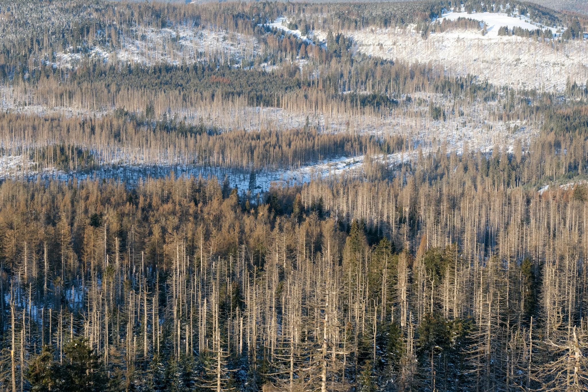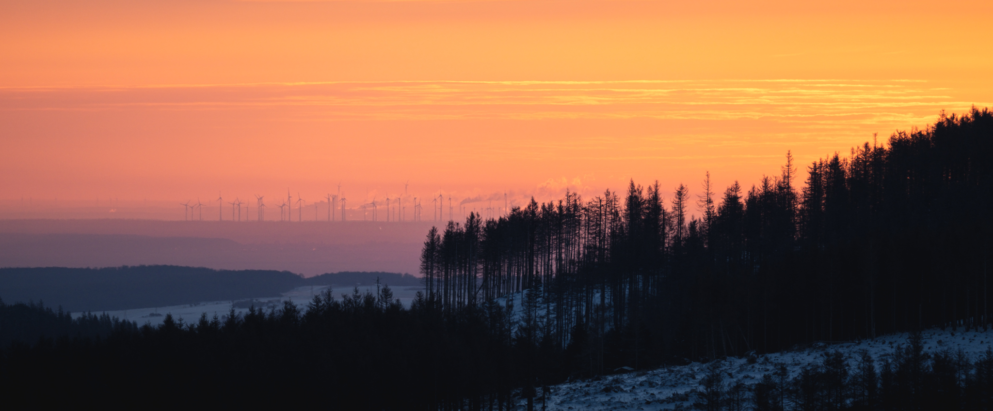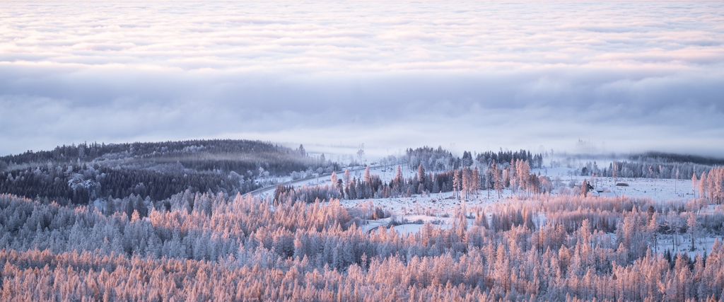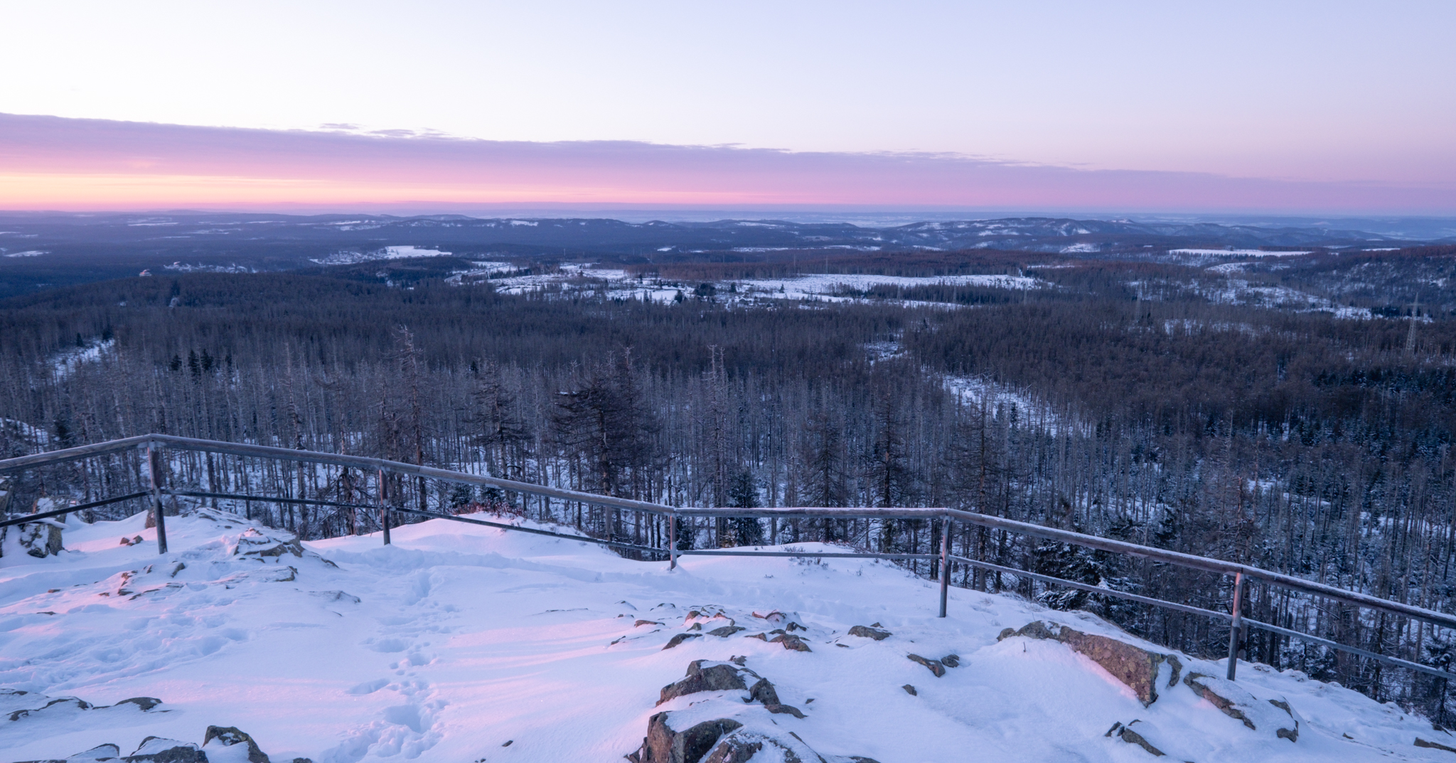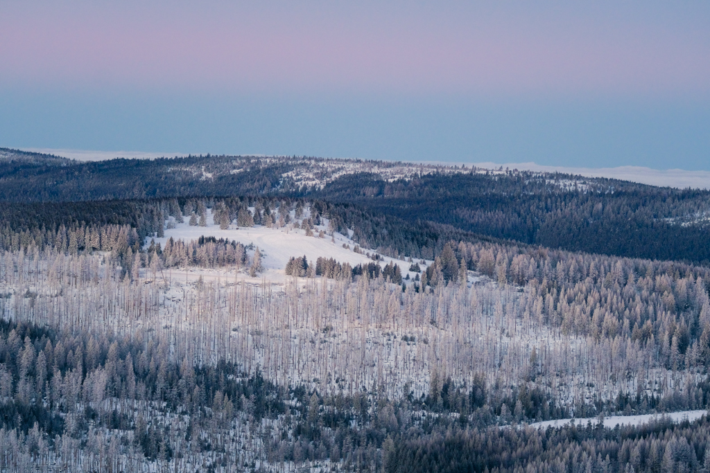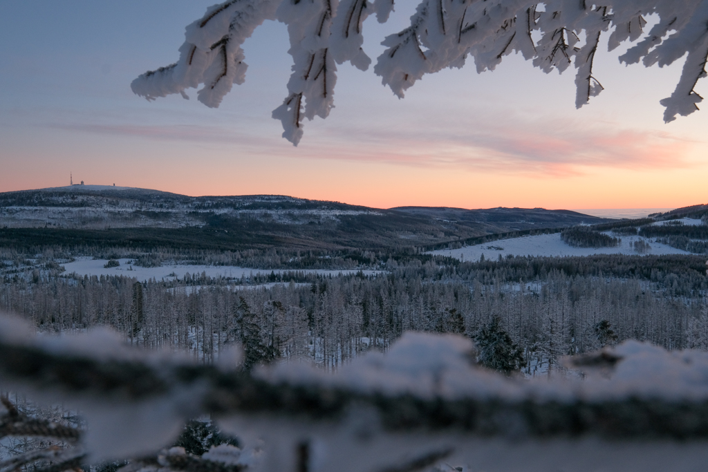 Last weekend we decided for the latter: My father and I entered the parking lot at 5 a.m. to, again, get on top of Achtermannshöhe in the Harz Mountains before sunrise (check out Clear Skies and Minus 14 Degrees). From the weather forecast it was unclear if we will be engulfed in clouds or if the clear sky would stretch out above us. Luckily, it was mostly the latter, with some distant orange strips of haze and clouds illuminated by the rising sun. We persevered for 90 minutes in the freezing cold with numb hands and feet, but a breathtaking view made it worth it. In the North, the silhouette of the Brocken towers; in the East, black trees in contrast to orange and purple plains stretching behind; rolling hills dipped into pastel colors in the South; and in the West, the Upper Harz in blue and purple with alternating rows of dead and healthy trees.