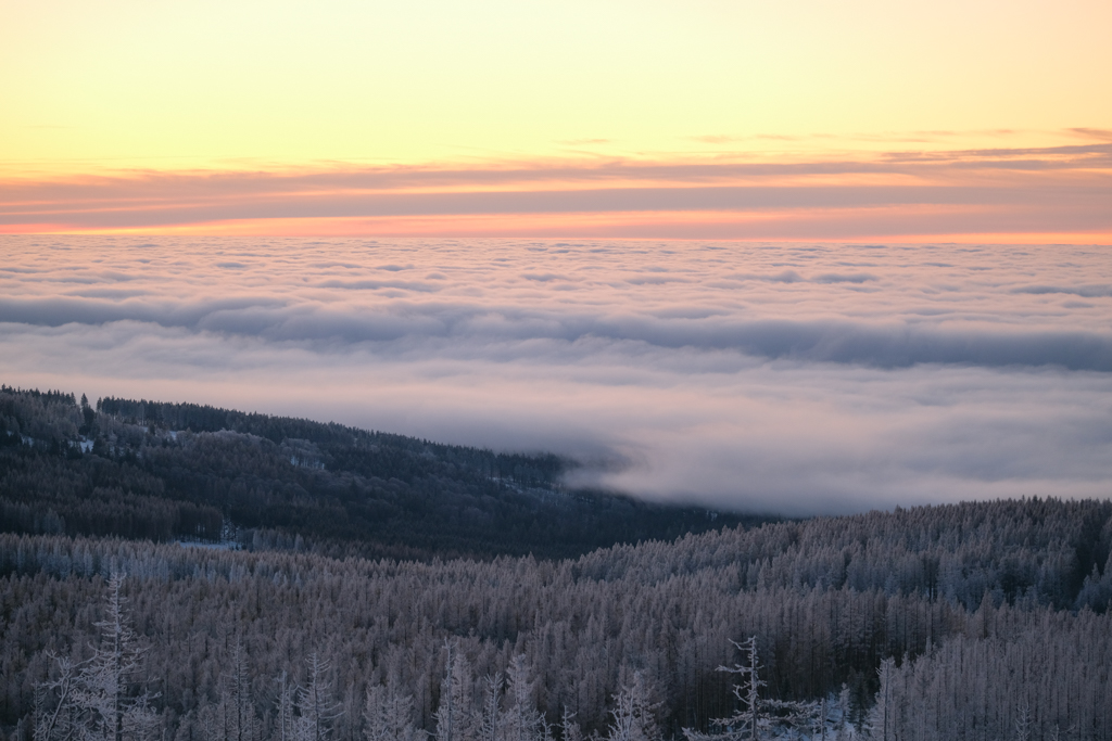 Brocken, 1141 metres above sea level, at 07:37 a.m. Rising sun behind Wurmberg, the cold temperatures were slowly creeping through the clothes.Sea of clouds towards the south, covering our home town somewhere in the far distance.Finally, the sun appeared in the east, and all colors changed from a cold blue to a warm orange.Again Brocken, illuminated by the first rays of light. When zooming in on the full sized picture, you can spot tons of people on the summit.