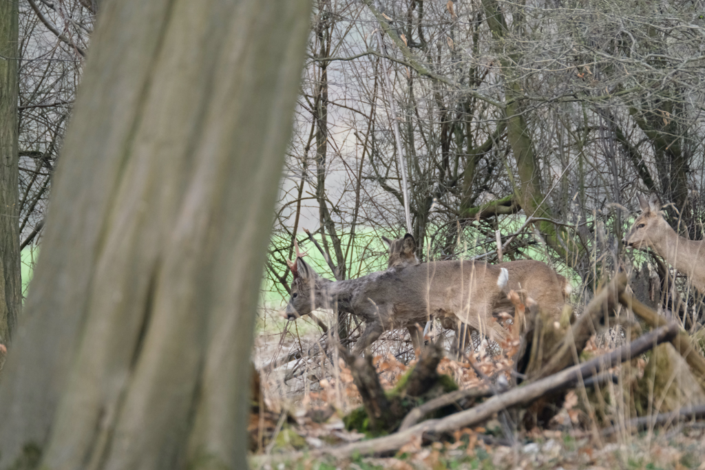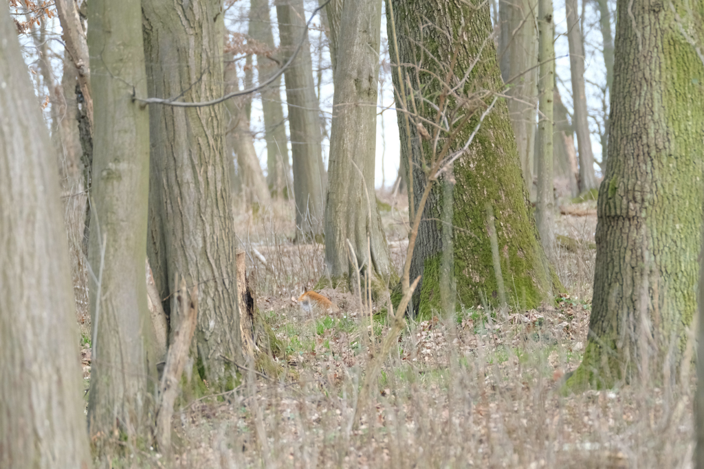 On Thursday and Friday I made my first two attempts. Due to work, I started at the unusual time of 2 p.m. My location research seemed to be quite good though: On both days I encountered several deer, multiple rabbits, and a fox. However, all of the shots are totally unusable because I never could get close enough or a nice angle. Mostly, because I did not dare to get closer to the animals; but also two times because I scared some of the deer away when they noticed (I guess) my smell because of turning winds; and multiple times because they got scared by other people walking the paths in the narrow woods.