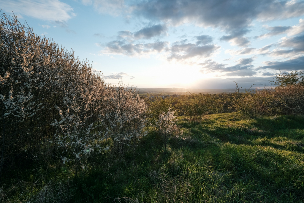 There has been too little time to appropriately maintain the blog lately. Lots of work, some routesetting, and other hobbies devour my time. I also often feel restless when I have some free space, it feels like I need to use these hours in some meaningful or productive way – whatever that means. When I have a free evening I mostly go outside to take some pictures. Last week I was on a small hill south of our home town for the sun set. After many days of rain, the sun finally showed again and all plants sprouted, especially the hawthorn.