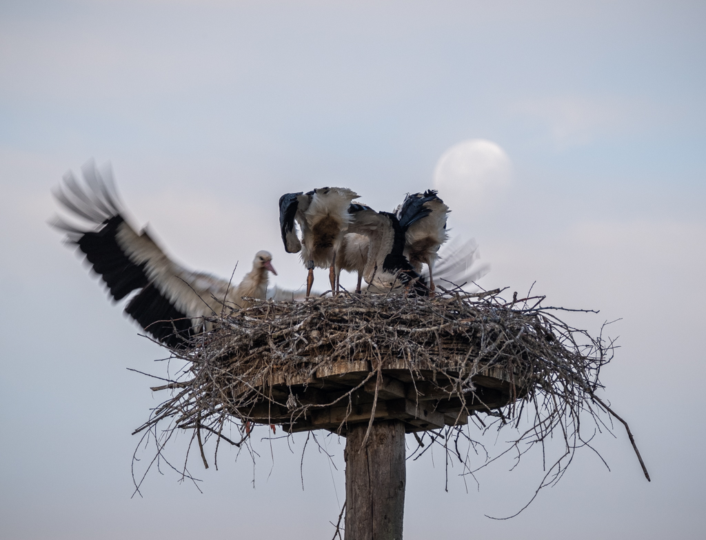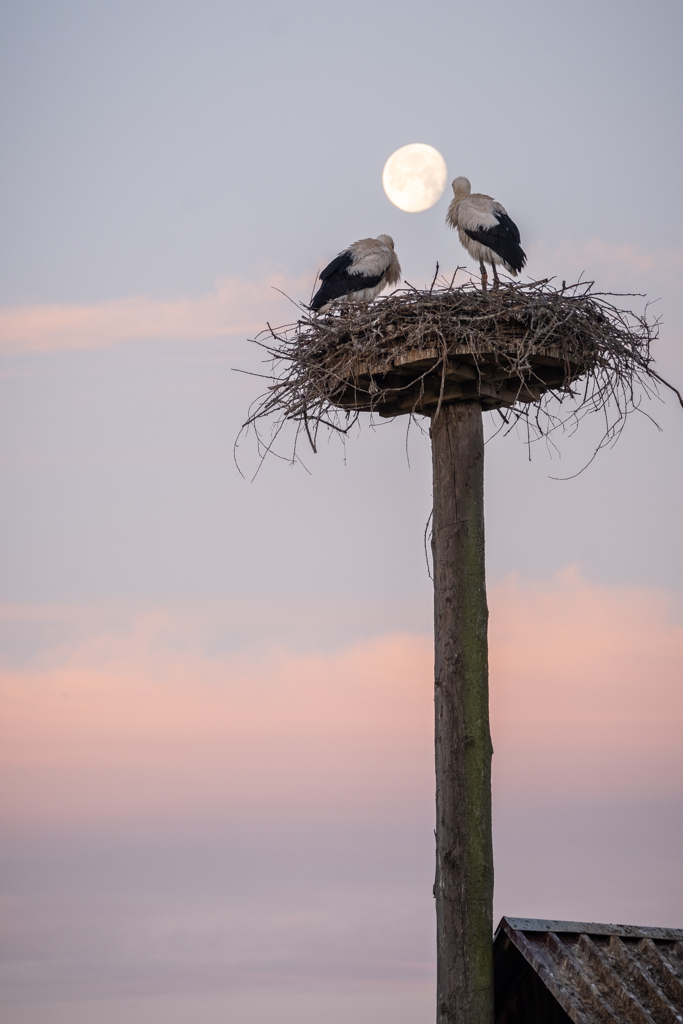 Getting usable pictures turned out difficult: At first, the moon was too high and at that angle it was impossible to have the storks in front. With the setting moon the angle got better, but the rising sun caused the moon to fade in turn. There was only a brief time window where it actually kind of worked.