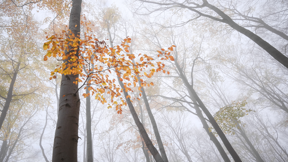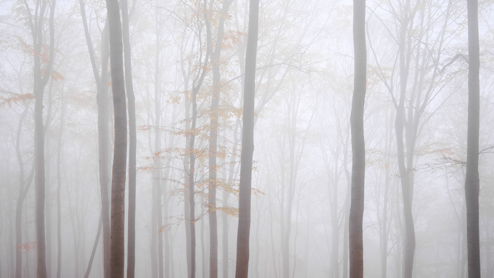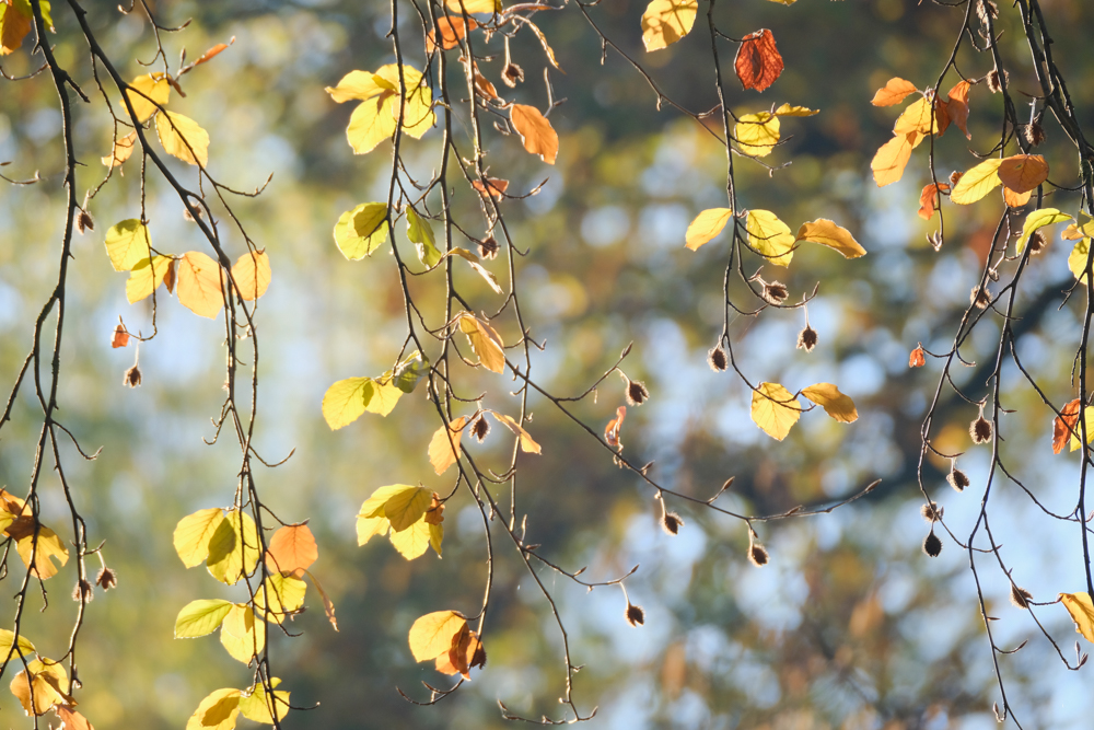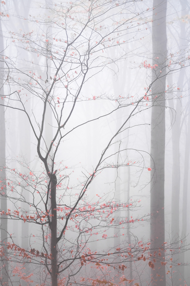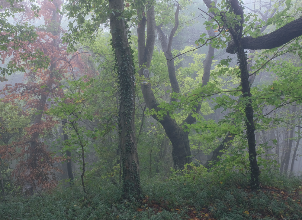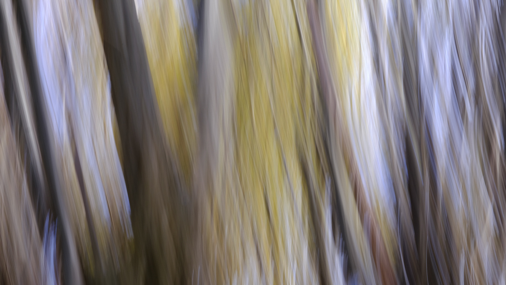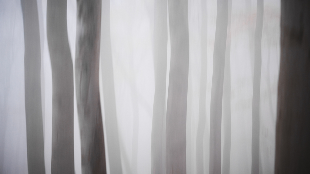 Frigid air blows through the woods, blows rigid thoughts away; and gray clouds pervade the vale, play with remaining leaves. Draining anger and despair, the trees take always care.