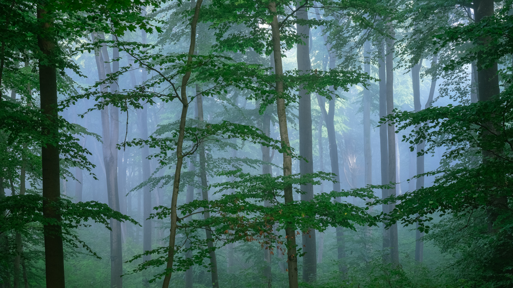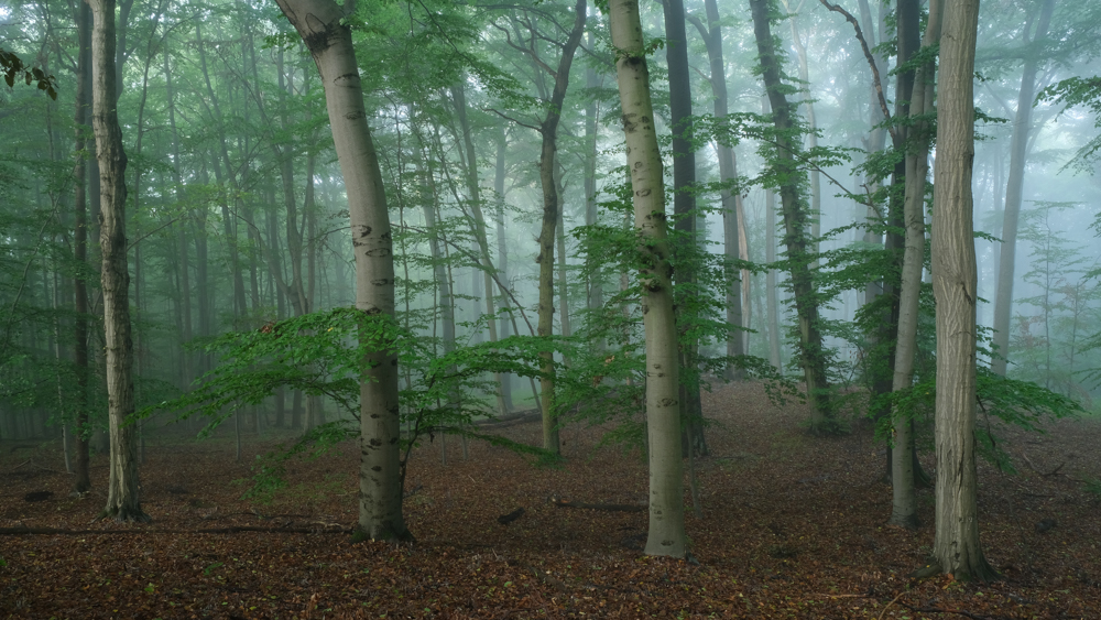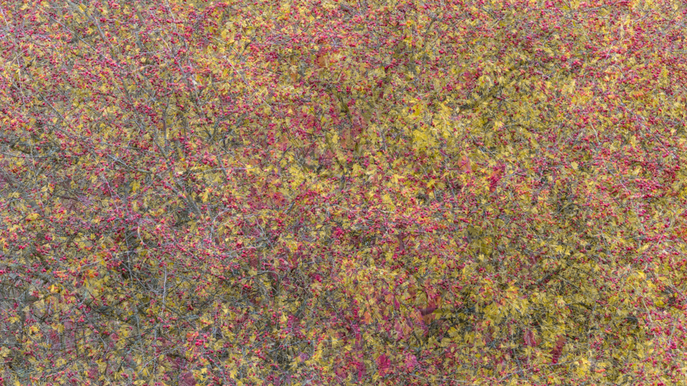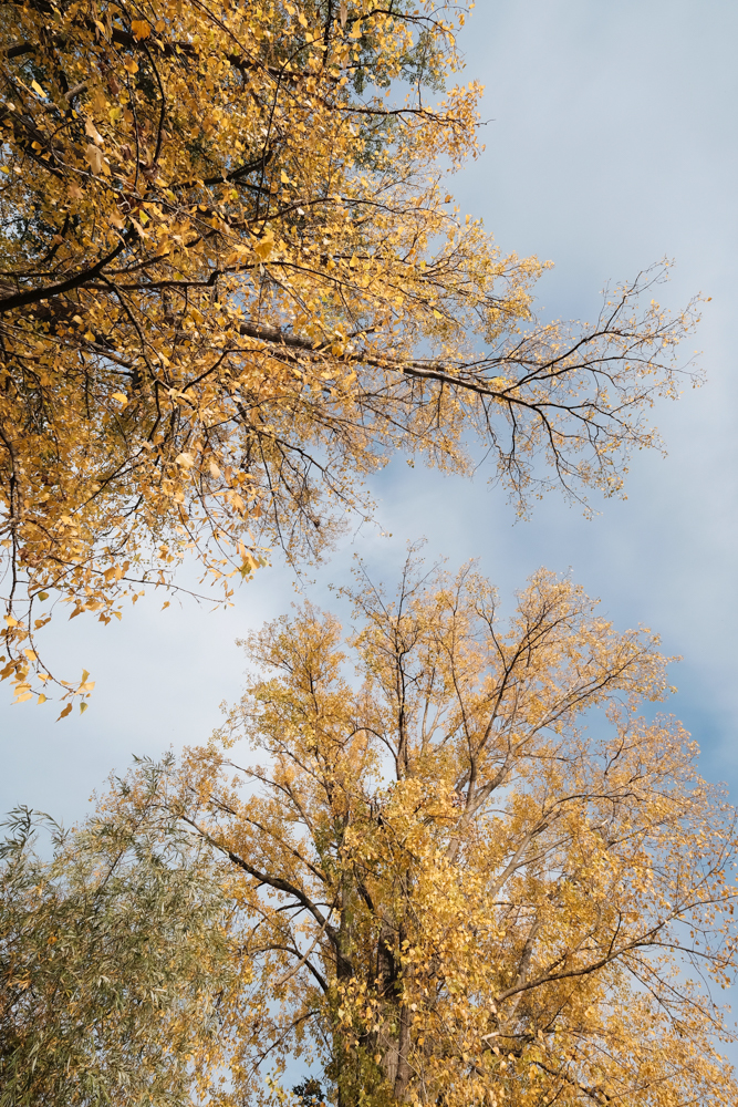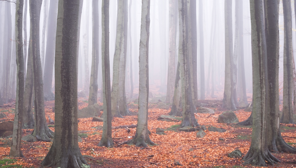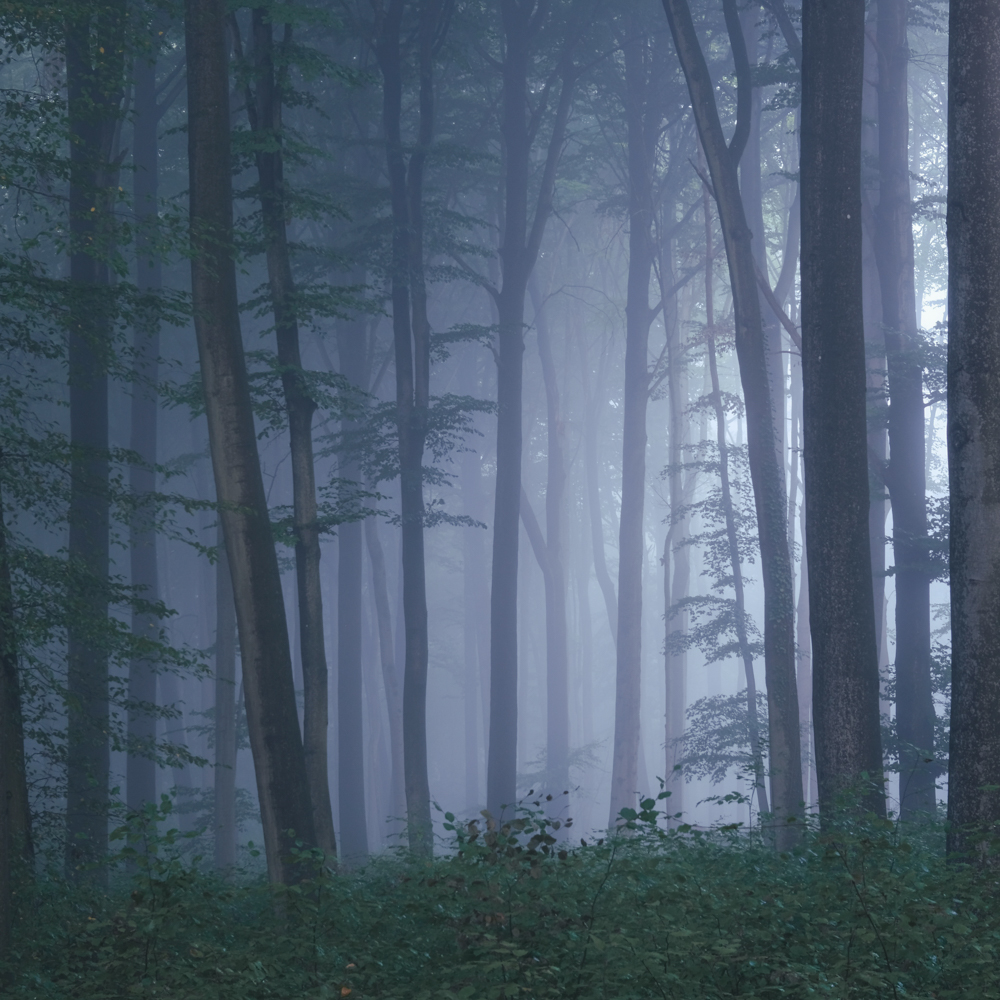Frigid air blows through the woods, blows rigid thoughts away; and gray clouds pervade the vale, play with remaining leaves. Draining anger and despair, the trees take always care.