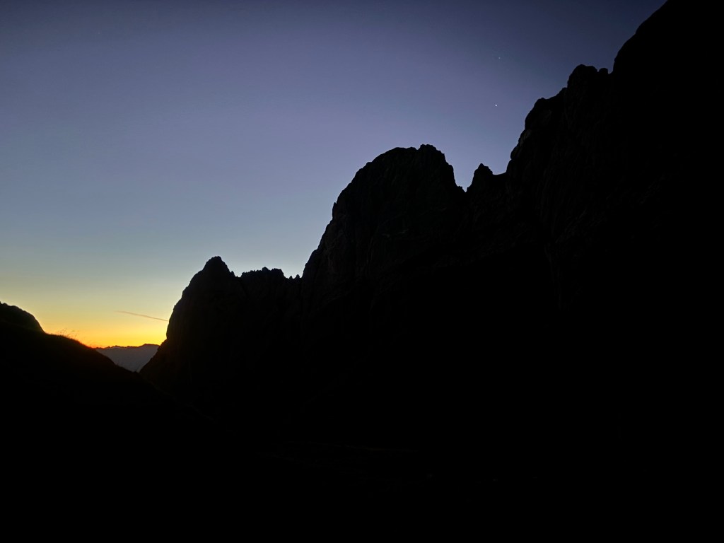 Heute also in der leichten Fassung von West nach Ost; denn andersrum startet man mit dem Ostgrat an K1, der uns (an einem anderen Tag) im ersten erfolgreichen Durchstieg (oben über Alter Nord) schon alleine fast einen ganzen Tag gekostet hat. Während unserer letzten zwei Besuchen hatten wir uns schon mit Abschnitten der Traverse bekannt gemacht, denn diese alpinere Umgebung ist uns Sportkletterern doch eher ungewohnt: Ein “leichter Abstieg in grasigem Gelände” kann sich für die ungeübte Person auch schnell mal schwieriger und unsicherer anfühlen, als eine 7 im Donautal, und ein “versteckter Abseilring” an K2 einen mehr zur Verzweiflung bringen, als eine abgespeckte Leiste in der Schlüsselstelle. Aber auch die Wegfindung fiel uns während diesen Erkundungstouren häufig schwer und war langwierig; da braucht es wohl noch etwas mehr Übung und Intuition für zukünftige Touren. Doch für heute sind wir mit dem Gelände zwischen K8 und K3 schon gut vertraut, was uns Mut für den Tag gibt.