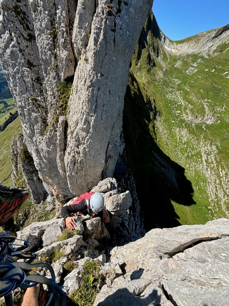 Von hier beobachten wir mit etwas Unbehagen den Andrang auf K3 – den wohl beliebtesten aller Kreuzberge. Während wir bisher noch nicht einer Menschenseele begegnet sind, staut es sich im Schmalen Südrippli (unserem präferierten Aufstieg für K3) beachtlich: Am ersten Stand sind mindestens 6 Leute zu erkennen, die sich erstaunlich lange nicht vom Fleck bewegen. Weiter oben sind weitere Seilschaften unterwegs. Was tun? Erst einmal weiter: Der Abstieg von K4 ist bezaubernd und erfolgt leicht südseitig. Erst eine Rinne hinunter, dann über ein etwas schmaleres Felsband (5 Haken vorhanden falls Absicherung erwünscht), und anschließend über einladende Wiesen zur Scharte vor K3. Es hat sich seit unseren Beobachtungen wenig geändert, daher wählen wir stattdessen den Anstieg über das Breite Südrippli und stehen um 15 Uhr auf dem Gipfel. Im Vorhinein wurde uns von einigen empfohlen die Traverse hier abzubrechen, denn es folgen Passagen in loserem Gestein. Aber was wäre das denn für eine Traverse? Wohl keine richtige. Der Abstieg über K3 kommt uns nicht so schwierig vor, wie befürchtet. Zumindest wenn man nicht alles absteigt: Wir folgen dem Grat hinab für etwa 50 Meter zu einem Ring an welchem wir 50 Meter abseilen in Richtung Vorgipfel.