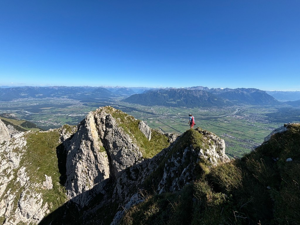 Gespreizt im Spagat wieder etwas hinauf klettern bis man auf der anderen Seite eine gute schmale Schuppe erreicht mit derer man sich an die andere Wand ziehen kann. Leicht links haltend folgt ein neuer Bohrhaken, anschließend ca. 7 Meter durch leichtes Gelände zum Ring gegenüber aufsteigen. Die nachsteigende Person sollte im Abstieg nicht fallen, hat dafür dann einen entspannteren Aufstieg auf der anderen Seite. Der anschließende Grat ist einfaches Gelände und führt in bestem Fels auf K1. 18:50 Uhr. Geschafft!