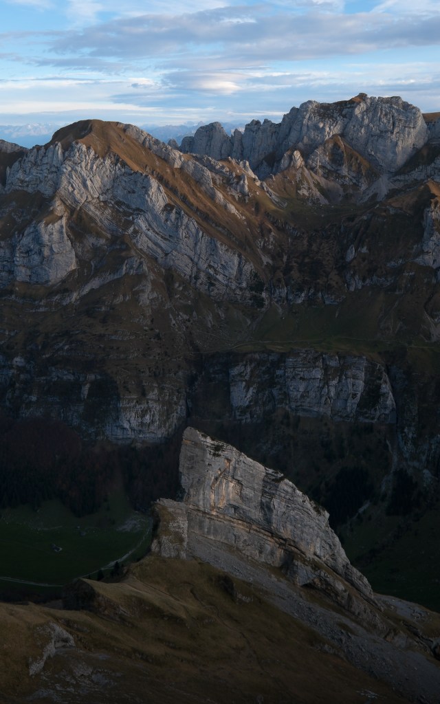 Während wir den Kreuzbergen im Osten des Alpsteins im letzten Spätsommer schon vielfach Besuch abgestattet haben, blieb der Süden für mich bisher unbekanntes Gelände. Daher nehmen wir heute (26.10.2024) als sachte Einführung die Schafbergkante am Wildhuser Schafberg. Es ist ein wohliger Sommertag im späten Oktober: Der Zustieg ist gesäumt von bunten, raschelnden Blättern, die Sonne wärmt von außen, und der kurze steile Anstieg von innen, insbesondere weil wir einen ungewollten Abstecher nehmen und einige Höhenmeter extra zurücklegen müssen.